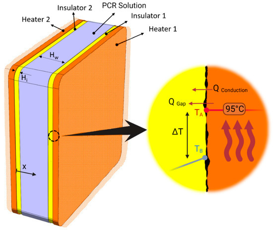 Simulation domains and contact resistance between the heater surface and insulator. Orange layers show a thin layer (thickness = 300 μm) of heater with a constant temperature of 95 °C; yellow layers show the insulator (thickness = 25 µm to 150 µm); and the blue layer shows the PCR solution considered as water (thickness = 100 µm to 500 µm). Only a thin layer (300 µm) of heater very close to the interface has been considered.