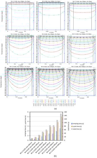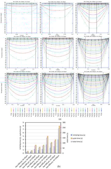 (a) Effect of chamber height and contact resistance on temperature distribution over time. The solid vertical black lines mark the insulator-to-solution transition and the horizontal line at 93 °C marks the maximal allowed spread of reactor mix temperature (2 °C). (b) Ramping, cycle, and total times of different configurations of contact resistance and water heights.