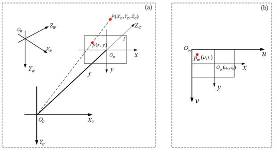 Diagram of the camera perspective projection model. (a) World coordinate system and camera coordinate system; (b) image coordinate system and pixel coordinate system.