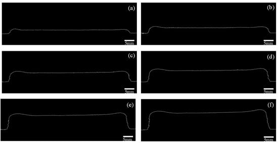 To extract the pertinent information regarding the cladding layer height, the thresholded image underwent edge detection, specifically targeting the top edge profile of the cladding layer. This extracted profile encapsulated the essential details required for accurately calculating the cladding layer’s height. By employing the edge detection technique, the prominent edges of the cladding layer were detected and extracted, thereby facilitating precise determination of its height through subsequent analysis. The image after the canny operator edge detection process is shown in Figure 6.