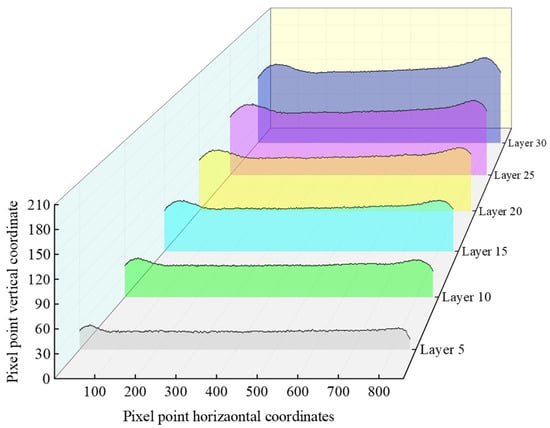 The image after Canny operator edge detection was pixel traversed, the grey value of each pixel was traversed in turn, and the horizontal and vertical coordinates of the pixel with a grey value of 255 were recorded to obtain the horizontal and vertical coordinates of each pixel in the extracted edge profile of the thin-walled part. The vertical coordinate of the topmost contour of the substrate was subtracted from the vertical coordinate of each pixel point at the edge of the contour to obtain the pixel height of the thin-walled part. In this way, the overall pixel heights of the thin-walled parts in layers 5, 10, 15, 20, 25, and 30 were obtained, and the results are shown in Figure 7.