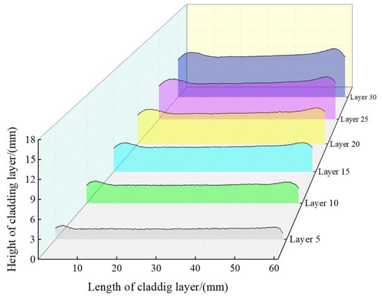 According to the camera calibration results and the inverse perspective transformation model, the coordinate points were transformed with inverse perspective to obtain the actual height of the cladding layer. The heights of the 5th, 10th, 15th, 20th, 25th, and 30th cladding layers are shown in Figure 8.