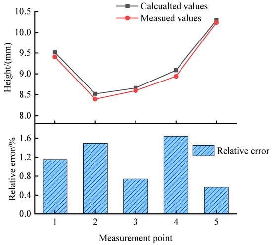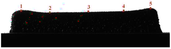 The cladding height calculation error was obtained by comparing the cladding height calculation results with the height measurement values. Five positions were selected on the uppermost contour of the finished 30-ply thin-walled part, at approximately 4 mm, 20 mm, 35 mm, 48 mm, and 59 mm from the leftmost end in the horizontal direction, and the five selected measurement positions are shown in Figure 9.
