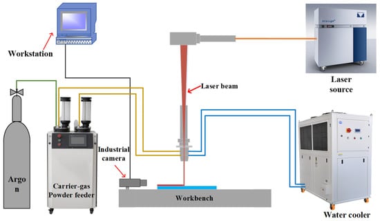 All experiments in this study were carried out on a laser solid forming equipment, which consisted of a KUKA robot, a co-flying water cooler, a carrier air powder feeder, and a 3 Kw power All-Light laser and laser head. The laser head was connected to a water cooler to avoid damage to the equipment due to high temperatures during the manufacturing process. The powder feed gas and protective gas were both 99.99% argon with a gas flow rate of 12 L/min. The laser solid forming system is shown in Figure 12.