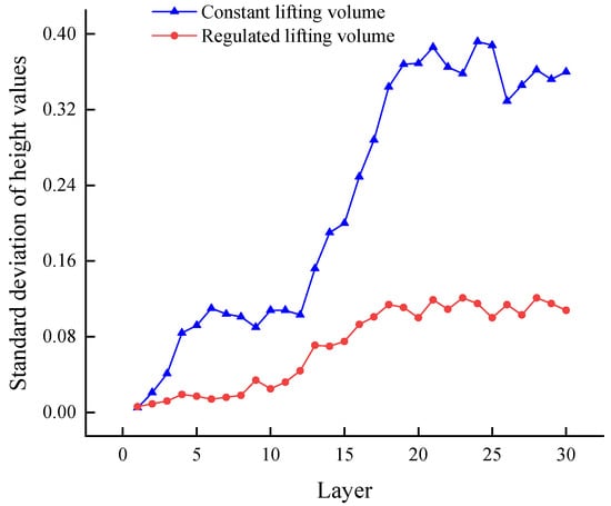 Each layer of cladding in the experiment was monitored paraxially, the standard deviation of its height value per layer was calculated, and the results of the experiment are shown in Figure 13. The blue line in Figure 13 represents the standard deviation of the height per level for the constant z-increments experiment, and the red line represents the standard deviation of the height per level for the real-time, regulated z-increments experiment.