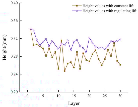 As can be seen from Figure 14, the height per layer for the real-time, regulated Z-increments experiment is significantly greater than the height of the cladding layer for the constant Z-increments experiment. The analysis concluded that the effect of the off-focus amount on the cladding height was reduced by regulating the Z-increments, increasing the amount of powder entering the melt pool and improving powder utilization. At the same time, the standard deviation of the layer height was calculated. The layer height of the cladding layer in the controlled Z-increments experiment fluctuated less, and the standard deviation of the layer height was 0.015 mm; the layer height of the constant Z-increments experiment fluctuated more, and the standard deviation of the layer height was 0.027 mm. By controlling the z-increments, the layer height of the thin-walled part was relatively stable.