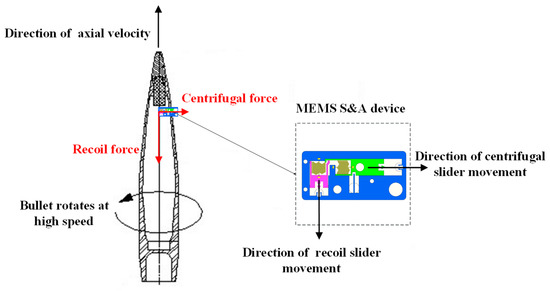 During the launch process, the axial velocity of the projectile rapidly increases to hundreds of meters per second under the chamber gas pressure generated by propellant combustion. Meanwhile, the MEMS S&A device is subjected to considerable launch recoil. The recoil slider overcomes the spring tension and moves downward. When it reaches the bottom, the clamping head on the recoil slider enters the clamping holder on the recoil safety unit and is constrained from resetting by the holder, releasing the first protection of the system (recoil protection). Due to the rifling in the barrel, the rotational speed of the projectile squeezed into the barrel rapidly increases to several 1000 or even 10,000 rotations per minute (r/min). Accordingly, the MEMS S&A device is also subjected to considerable centrifugal force. Under the centrifugal force, the centrifugal explosion-proof slider overcomes the spring tension and moves outward, and it is then fixed by the clamping holder on the centrifugal protection unit. The explosion-proof effects on the detonation sequence are then relieved, completely releasing the protections of the system (centrifugal protection). The forces and movements of the functional units in a MEMS S&A device are presented in Figure 2.