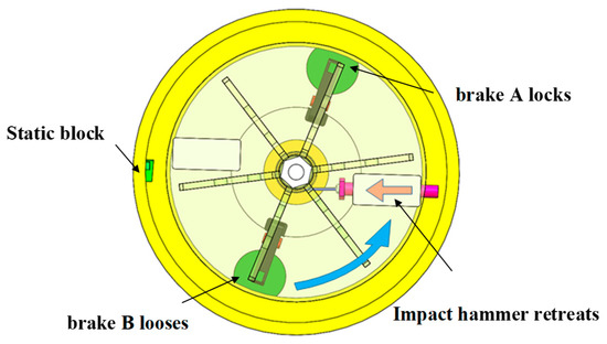 Before testing, the block equipped with the test piece of the MEMS S&A device is placed in the circular track and remains stationary with electromagnetic brake A locking the brake disc and electromagnetic brake B remaining loose. The variable-frequency motor is started and drives the centrifugal rotary table via the main shaft. Owing to the locking effect on the brake disc fixed with the cylinder, the cylinder is inhibited from rotating and remains stationary. Therefore, relative rotation occurs between the cylinder and the centrifugal rotary table. As the wire rope winds around the cylinder, the impact hammer is pulled back to the bottom of the limit groove. As shown in Figure 5, after the rotary table turns to a certain degree, its rotation becomes limited. As the torque output of the motor increases constantly, the rotary table and the cylinder overcome the friction braking force imposed by electromagnetic brake A (the torque output of the motor becomes larger than the braking torque of electromagnetic brake A), and then the rotary table rotates together with the cylinder and the braking disc (the static friction of electromagnetic brake A changes to dynamic friction) until the preset rotation speed is reached.