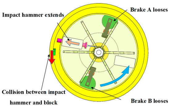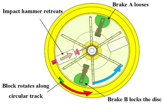 Under the high-speed collision of the impact hammer, the block acquires a certain speed and performs inertial motion along the circular track. Meanwhile, as the block is subjected to a centrifugal force, centrifugal overload loading is performed. The block speed after collision is higher than the speed of the impact hammer, leading to a secondary collision between the block and the impact hammer. To avoid this situation, electromagnetic brake B has been added to the system. As shown in Figure 7, after the collision between the impact hammer and the block, electromagnetic brake B locks the brake disc to provide the cylinder with a braking torque. Meanwhile, as the wire rope winds around the cylinder, the impact hammer retreats to the bottom of the limit groove under the pulling force of the wire rope.