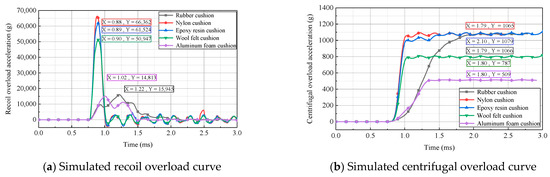 The acceleration curves of the simulated recoil overload and centrifugal overload for different cushioning materials at a centrifuge speed of 700 r/min are presented in Figure 11. As shown, compared with nylon, wool felt, and epoxy resin, cushions made of aluminum foam and rubber exhibited superior energy-absorbing and buffering effects, including a longer rising edge of acceleration, a lower peak acceleration, and larger effective pulse width. However, the acceleration peak for centrifugal overload in the case of the aluminum-foam cushion was only 509× g, which did not conform to the requirements in the simulation tests. According to an analysis, this was attributed to the fact that significant plastic deformation occurred in the aluminum-foam cushion, causing a considerable energy dissipation and velocity attenuation of the block rotating along the circular track. Rubber cushions can better achieve the conversion between kinetic energy and internal energy, making rubber an ideal cushioning material for simulation tests of 2D overload loading.