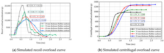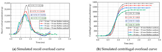 The acceleration curves of the simulated recoil overload and centrifugal overload obtained using cushions with different thicknesses and the same cross-sectional area at a centrifuge speed of 700 r/min are presented in Figure 13. As shown, with an increase in the rubber-cushion thickness, the rising edge of acceleration for recoil overload and centrifugal overload was elongated, while the peak acceleration decreased. The rubber-cushion thickness significantly affected the overload pulse, which exhibited obvious discrepancies among the curves. Therefore, selecting rubber cushions with different thicknesses is an effective method for adjusting the peak and width of the 2D overload pulses.