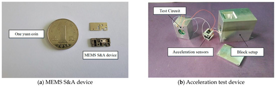 The block setup was composed of three parts: the test piece of the MEMS S&A device, an acceleration tester, and a block shell. Two acceleration sensors for high g-values (BM1001) were adopted in the acceleration tester, and their measurement ranges were set as ±30,000× g and ±5000× g, respectively. After calibration, these two acceleration sensors were installed on sensor bases along the X-axis and Y-axis, which corresponded to the directions of the recoil overload and centrifugal overload, respectively. An internal trigger approach was adopted by the testing system, with a trigger threshold of 1000× g, sampling frequency of 200 kHz, and storage time of 16 s. The trigger was manually powered on. To ensure reliable data acquisition and storage, the interior of the test devices was encapsulated with epoxy resin. The photographs of the MEMS S&A device and block setup are shown in Figure 15.