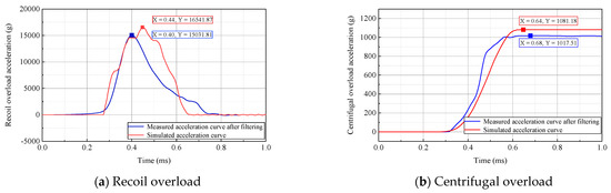 In the experimental tests, the centrifuge speed was set to 700 r/min, and a rubber pad with a cross-sectional area of 60 mm × 70 mm and a thickness of 30 mm was selected as the cushion. Data acquired from measurements during the 2D overload simulation test are presented in Figure 16. As shown, the measured acceleration curves contained high-level noise signals; hence, it was necessary to filter the measured curves. MATLAB software was adopted to perform low-pass filtering on the measured data. The 2D overload curves after filtering with a cutoff frequency of 2.5 kHz are presented in Figure 17. As shown, the measured peak acceleration for recoil overload was 15,032× g, which was 1510× g lower than the simulation curve, with a decrease of 10.05%. The pulse width of the recoil overload could reach 512 μs, which was basically consistent with the simulated curve. The measured peak acceleration for centrifugal overload was 1018× g, which was 64× g lower than the simulation curve, with a decrease of 6.29%. From the results, this difference is within a reasonable error range. The requirements for 2D overload simulation were satisfied.