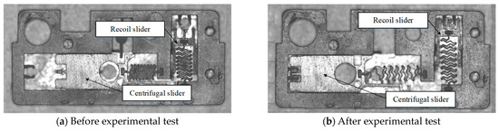 The MEMS S&A device was observed before and after the experimental test using an electron microscope, as shown in Figure 18. The recoil slider head was squeezed into the holder and the recoil slider unit released the constraint on the centrifugal slider unit. The centrifugal slider head was also squeezed into the holder and the MEMS S&A device successfully released the protections.
