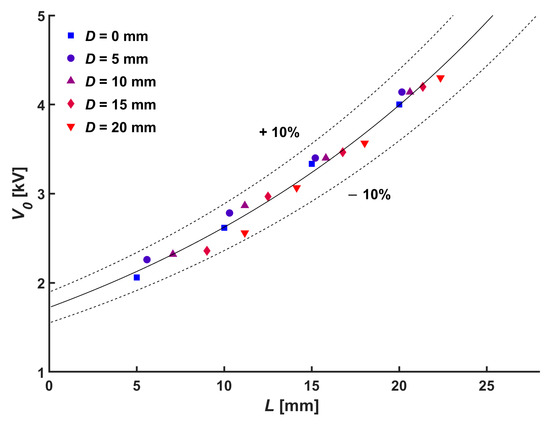 The normal distance between the emitting electrode and the collecting electrode is the main parameter of the onset voltage (V0) at which the electrical discharge is initiated [24,25]. In the configuration of this study, the absolute distance from the needle tip to the mesh electrode surface exceeds the normal distance due to the central hole in the mesh electrode. Consequently, the onset voltage shown in Figure 2 is proportional to the absolute distance as follows: