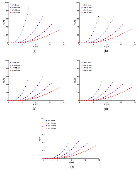 Relation between applied voltage and current according to hole diameter, D: (a) 0 mm, (b) 5 mm, (c) 10 mm, (d) 15 mm, and (e) 20 mm.