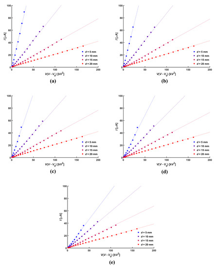 The Townsend relation was determined from the experimental results and established as the following mathematical expression of the relationship between corona current and applied voltage [26]: