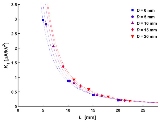 The onset voltage, which is one of the electrical characteristics of the ionic wind generator, has a relationship with the absolute distance, K1, which represents the electric sensitivity of the configuration due to the gaseous space between the electrodes, which behaves like an air capacitor with an air dielectric. Figure 5 shows the relationship between K1 and absolute distance. A lower electric sensitivity between the corona current and applied voltage was observed as the absolute distance increased. The general relation between them could be expressed as follows: