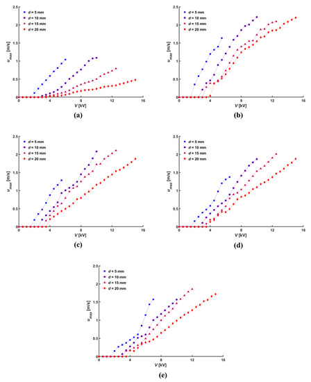 Maximum velocity of ionic wind according to various hole diameter, D: (a) 0 mm, (b) 5 mm, (c) 10 mm, (d) 15 mm, and (e) 20 mm.