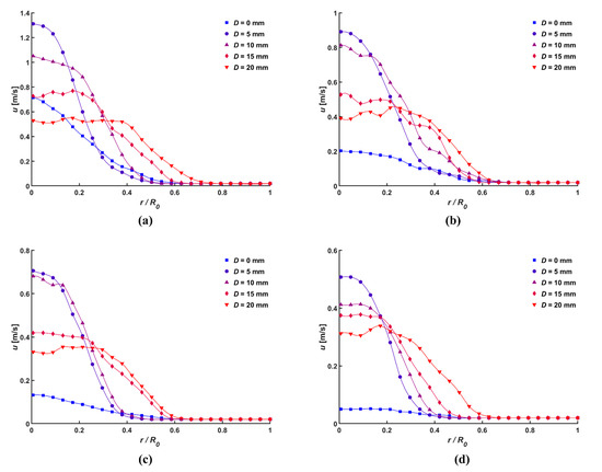 Velocity distribution of ionic wind according to various distance, d: (a) 5 mm, (b) 10 mm, (c) 15 mm, and (d) 20 mm, with V = 5 kV.