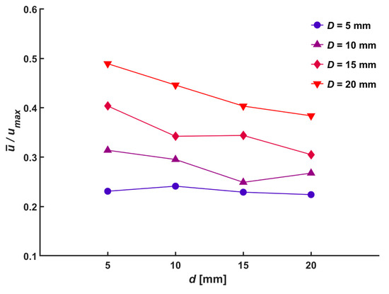 Ratio between average velocity and maximum velocity for various hole diameter, D.
