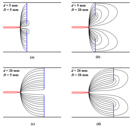Schematic of electric field for various distance and hole diameter: (a) d and D = 5 mm, (b) d = 5 mm, D = 20 mm, (c) d = 20 mm and D = 5 mm, and (d) d and D = 20 mm.
