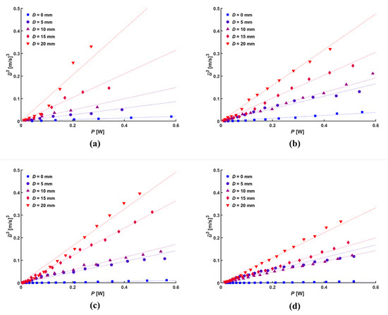 Linear relation between electric power and average velocity cubed for various d: (a) 5 mm, (b) 10 mm, (c) 15 mm, and (d) 20 mm.
