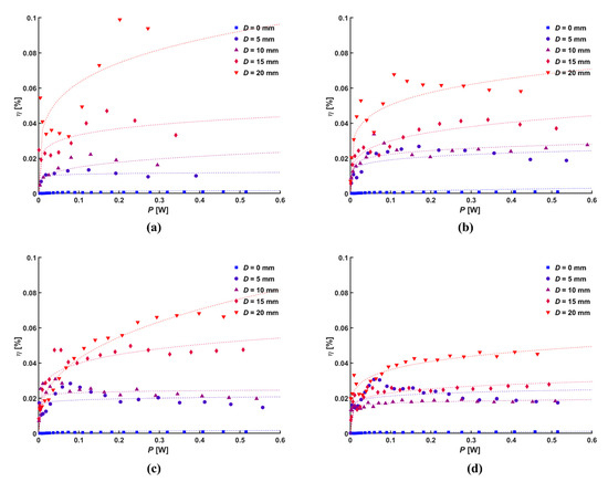 Conversion efficiency according to discharge power for different d: (a) 5 mm, (b) 10 mm, (c) 15 mm, and (d) 20 mm.