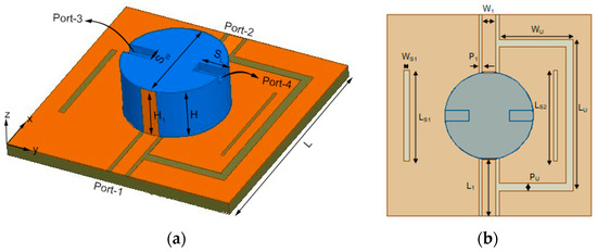 Up to now, plenty of decoupling methods have been introduced to alleviate the mutual coupling between antenna elements to achieve high isolation and acceptable DRA performance, such as parasitic elements [15,16], detected ground structures (DGSs) [17,18], metamaterial [19,20,21,22], and orthogonal modes induced by hybrid feeding mechanism [23,24]. An L-shaped dual-band MIMO DRA, which is excited by two microstrip line bending coupling slots and a cylindrical air gap to achieve good isolation of 17 dB, was introduced for LTE applications in [10]. Another dual-band MIMO design with the cylindrical DRA for the bands of DCS and WLAN is demonstrated in [9]. This antenna possesses good isolation thanks to the DRA-created orthogonal modes in the DRA. Triple-port MIMO cylindrical DRA-generated TM01δ and HEM12δ+1 modes were designed in [11]. Das et al. presented a six-port and back-to-back four-port MIMO DRA-created gradient FSS as partially reflecting surfaces for the use of WLAN [21,22], where the isolation of the system can be realized over 20 dB and the size of the four-port antenna was 112 × 112 × 31.6 mm3. In [23], a spatially independent eight-port box-formed MIMO DRA was designed with the isolation of better than 20 dB and a size of 52.4 × 52.4 × 25 mm3 by adopting the exciting technology of orthogonal mode and spatial decoupled radiation mode. More recently, specific higher-order modes have been proposed to realize the decoupling between the two antennas, which can improve the isolation around 30 dB in [25]. Moreover, polarization quadrature [26] and orthogonal circularly polarized modes [27] have also been widely applied. As there is no need to introduce additional decoupling structures, it is beneficial for the realization of miniaturization design of the MIMO antenna [25,26,27]. Although the majority of the previous studies have presented acceptable decoupling results, these designs generally exhibit complicated configurations and manufacturing processes, large volume, high profile, and limited decoupling bandwidth.