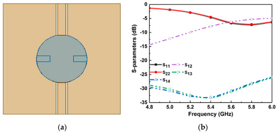 As shown in Figure 3a, port 1 (port 3) and port 2 (port 4) are symmetric with each other; that is, S11 = S22, S33 = S44, S13 = S24, and S23 = S14. In the following, port 1 is used as an example to explain the decoupling between port 1 and other ports. We can clearly observe from Figure 3b that perfect isolation (S13 < −30 dB) is achieved between port 1 and port 3 without additional operations because orthogonal modes ( and ) can be produced at DR by orthogonal positions for the two ports. In addition, ports 1 and 2 are both excited by CPWs, while the other ports are excited through coaxial probe. Moreover, Figure 3b also exhibits that both port 1 and port 2 have poor return loss and reverse transmission. The two symmetrically placed ports with the same excitation pattern and close spacing cause strong coupling, causing the antenna element to not work independently. Therefore, the design focuses on the decoupling structure between the symmetrical ports and close ports, and the corresponding method is listed in detail in the following.