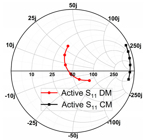 Thus, we can exploit CM and DM impedance analysis to study and mitigate the mutual coupling between different ports of Antenna 1. As shown in Figure 4, the active impedance of the CM can be obtained by simultaneously exciting port 1 and port 2 with in-phase signal. On the contrary, if port 1 and port 2 are simultaneously excited with out-of-phase signal, the active impedance of the DM is realized. Furthermore, we can see that the value of CM impedance is greater than 50 Ω, while that of DM lies around 50 Ω. The discrepancies of impedance between CM and DM can cause strong mutual coupling for these ports, which implies poor isolation. Thus, it is crucial to tune the corresponding CM and DM impedances to be consistent.
