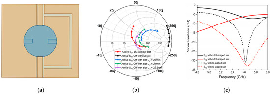 To realize a similar impedance for CM and DM, one U-shaped slot was added at the port of Antenna 1 to serve as a parallel LC resonant circuit (see Figure 5a), and the corresponding antenna is called Antenna 2. Figure 5b demonstrates the active S11 for Antenna 2 with CM and DM by changing the slot length Lu. It is clearly seen that the diminution of slot length can induce the CM impedance gradually to match 50 Ω and the similarity can be found with an optimized length of 22.5 mm. Meanwhile, the DM impedance basically remains around 50 Ω with the change in slot length, and it is not discussed in this paper for brevity. S11 and S12 with and without a decoupling U-shaped slot are shown in Figure 5c. We can find that both the impedance matching and isolation are promoted under the use of a U-shaped slot. The isolation can be improved from 5 dB to 33 dB.