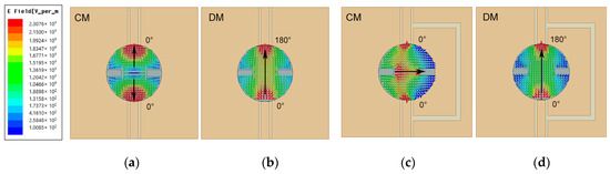Vector electric field at 5.6 GHz with (a) CM and (b) DM excitation for Antenna 1 and (c) CM and (d) DM excitation for Antenna 2.