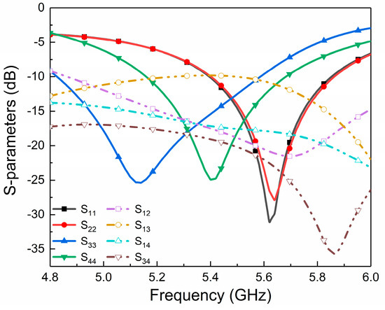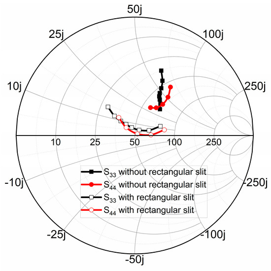 For ports 3 and 4, two coaxial lines are symmetrically located on both sides of the pro-posed DRA and inserted laterally into the feed, which can induce good isolation between the two ports. To improve the performance of impedance matching for each port and enable different ports to cover different frequency bands, the quarterwave rectangular slit perpendicular to the coaxial line is also etched on the ground plane. This design provides two additional degrees of freedom to the matching network. Based on the common bandwidth of four ports and composite applications of 5G and WLAN, port 3 and port 4 can achieve strong resonance at low frequencies by adjusting the length and position of the rectangular slit. The Smith chart in Figure 8 shows S33 and S44 with and without the inserted rectangles slits. We can observe that both port 3 and port 4 of the proposed antenna can achieve the matching impedance of 50 Ω. As can also be seen from the simulated S-parameters exhibited in Figure 9, both the reflection coefficients and isolation for the two ports are improved. Although it has a slightly negative impact on the decoupling between port 1 and 2, the reflection coefficient and isolation of all ports are in a good state as a whole.