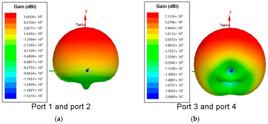 In addition, each port of the proposed antenna can be used separately or both together. In other words, when four ports are used separately, each port is individually connected to the feed port, and the other three ports are connected to the load to form a four-port MIMO antenna. When two ports are used together, two symmetrical ports (port 1 (port 3) and port 2 (port 4)) are fed differentially, and the other two ports are connected to the load. It is notable that the orthogonal modes in the DRA are excited by the two symmetric ports simultaneously, and their 3D radiation patterns are demonstrated in Figure 10. In such a case, the gain of the DRA can be up to 5.6 dBi and 7.1 dBi, respectively, which is higher than the gain of a single-port feed owing to the improved radiation pattern.