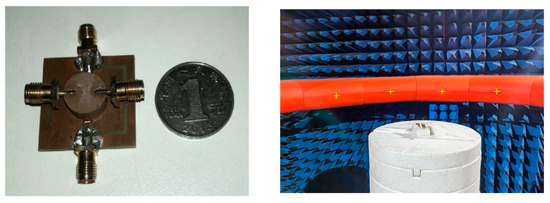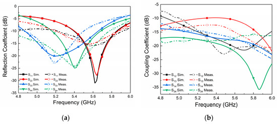 To demonstrate the effectiveness of the proposed four-port MIMO cylindrical DRA, an actual antenna prototype with a size of 30 × 30 × 8.1 mm3 is simulated, constructed, and measured (see Figure 11). Owing to the symmetry of their structures, we also take port 1 as the example to investigate the measured S-parameters. Figure 12 demonstrates the simulated and measured S-parameter results. The measured impedance bandwidths for antenna ports are 5.2–5.9 GHz (12.6%), 5.2–5.9 GHz (12.6%), 4.85–5.5 GHz (12.5%), and 4.8–5.75 GHz (18%), respectively. Figure 12b demonstrates that the isolation within the effective bandwidth is retained below 15 dB, but, owing to the compact size and multiple ports, the port of S13 exhibits a slight performance degradation, with the isolation being better than 12 dB. However, lower isolation has also been widely applied in 5G terminals [30,31,32].