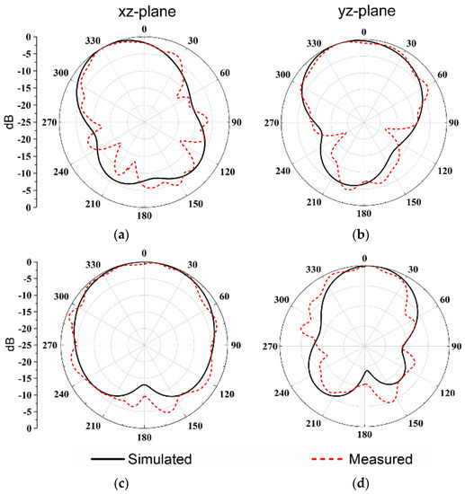 Figure 13 demonstrates the simulated and measured normalized 2D radiation patterns for the presented antenna excited from port 1 and 4. We can see that the measurement and simulation are in accordance with each other. It is worthy to note that the proposed antenna system is symmetrical, which can make the radiation pattern exhibit symmetry in the xz-plane as well as in the yz-plane when fed by port 1 and 2. The gain of the four ports at the center frequency is 5.4 dBi, 5.4 dBi, 4.5 dBi, and 4.5 dBi, respectively.