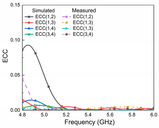 To evaluate the diversity characteristics and MIMO properties of the designed antenna, Figure 14 shows the envelope correlation coefficient (ECC) between antenna ports. The results show that the ECC between all ports in the common bandwidth is less than 0.004, indicating that a low correlation between the ports and good diversity performance can be expected.