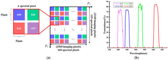Illustration of (a) the geometric arrangement and (b) the spectral transmittance of the filter mosaic used in this study.