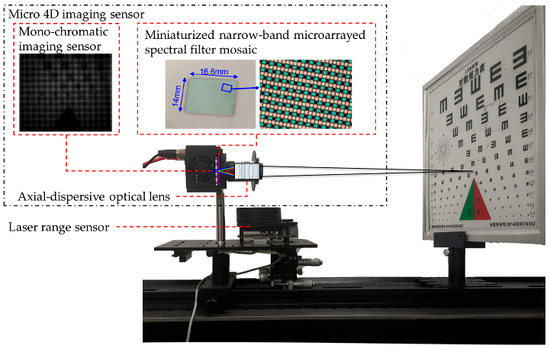 As shown in Figure 2, an experimental platform for the M4DI sensor is established, and Table 1 lists the components used in the experimental platform. The characteristic of the axial dispersion lens is that each wavelength of light has a different focal length, which enhances the defocus difference between spectral images. Light is filtered by a miniature narrow-band filter and captured by a grayscale camera. The laser range sensor is used to provide the true value of depth and is fixed with the M4DI sensor. The relative depth error of the laser range sensor is less than 0.2% in the range of 5 m.
