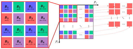 Figure 3 illustrates the spatial arrangement of four neighboring pixels of multiple bands Bi (i = 1, 2, 3, 4) within the raw image, which is determined by the filter mosaic shown in Figure 1a. At a single exposure, the M4DI sensor captured a raw image of the scene (Figure 3). A simple remapping algorithm was developed to separate the raw image R(r,c) (r = 1, 2, …, 2560; c = 1, 2, …, 2160) into four narrow spectral band images Bi (m,n), where i = 1, 2, 3, 4 and m = 1, 2, …, 135; n = 1, 2, …, 160, according to Equation (1):