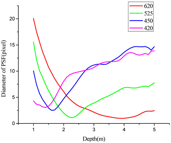 It can be seen from Equation (9) that the depth can be estimated from three spectral images. In the imaging system, there is a limit to the gradient change perceived by the image sensor. When the blur size is too large, it may cause a gradient change that is too small to be sensed by the sensor. Therefore, three spectral images with the closest central wavelengths are applied to Equation (9), and other spectral images provide depth estimation in a new range. In this paper, four spectral images are used for depth estimation:
