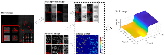 The image processing process of the M4DI sensor is shown in Figure 5. At a single exposure, four spectral images are separated from the original images. The spectral images are normalized, and then their gradient is calculated. We use the Canny edge detector to perform edge detection and estimate the depth at the edge (sparse depth). Finally, a depth map is obtained by filling the sparse depth according to the normalized spectral images.