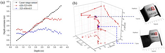 A plane sample was placed at intervals of 10 cm in the range of 1~4 m to test the accuracy and range of depth estimation. The result of the depth estimation is shown in Figure 6a. The true depth, illustrated by the black curve, was measured using a laser range sensor, which has 1 mm accuracy for a depth range within 5 m. When three channel images of 620 nm, 525 nm, and 450 nm are used as input images, the depth estimation range is 1.3~2.8 m. When three channel images of 525 nm, 450 nm, and 415 nm are used as input images, the depth estimation range is 1.1~1.4 m. Therefore, the depth estimation range of the M4DI sensor is 1.1 to 2.8 m. The maximum relative error of the M4DI sensor is within 7%. Our team further applied the M4DI sensor to recover the trajectory of a box printed with tiny characters. The central pixel position and depth of the character “U” (size: 10 × 17 mm) are given by template matching. The trajectories sampled at 16 different positions are shown in Figure 6b. This shows that the M4DI sensor could be applied to the field of target recognition and tracking.