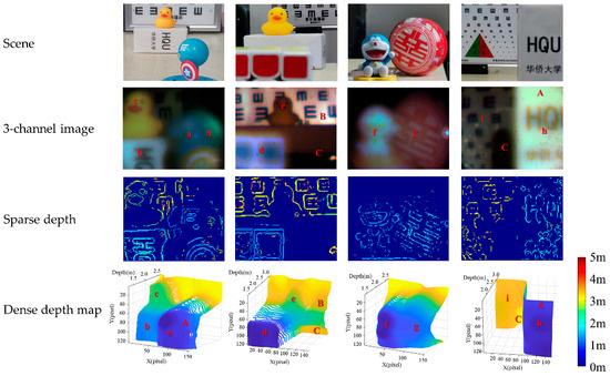 We further conducted a qualitative evaluation to test whether the M4DI sensor could conduct 3D sensing of a complicated object. Experimental samples were placed at different depths. The result of depth estimation is shown in Figure 7. Multiple factors could affect the depth measurement accuracy. One is the uneven reflectivity of the surface material, which would enhance the received light intensity, and hence, the gradient of a particular band if the reflectivity peaks at that band. Strong reflectivity in any one of the four narrow bands causes an apparently shallower depth than the real depth. Another is that no texture information is obtained, which means no information for depth in the passive depth estimation method. Specifically, as shown in Figure 7, the sample has no texture (symbol A), strong specular reflection (symbol B), and weak illumination (symbol C). Even with these error-inducing factors, the far–near relationship between samples can be distinguished, that is, a < b < c, d < e, f < g, and h < i.