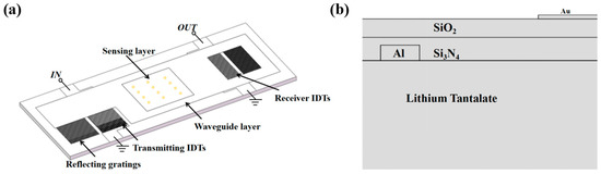 In this work, a delay line structure was employed for the sensor. A double-covered layer was deposited on the surface of the piezoelectric substrate to serve as the waveguiding layer. The schematic diagram of the device is shown in Figure 1a. Various piezoelectric materials have been utilized to excite L-SAW, with 36°Y-X LiTaO3 being particularly noteworthy due to its large wave velocity, significant electromechanical coupling coefficient (K2), and relatively low temperature coefficient of frequency (TCF) [24,25,26]. Table 1 displays the parameters of common piezoelectric substrate materials. Moreover, 36°Y-X LiTaO3 boasts high consistency and low insertion loss, making it a widely used piezoelectric material in commercial products. Thus, in this work, 36°Y-X LiTaO3 was chosen as the material for the piezoelectric substrate. In traditional SAW sensors, copper and gold electrodes with high densities are often used to prevent energy leakage and suppress Rayleigh-mode spurious response. However, this practice results in a phase velocity of SAW that is typically less than 3000 m/s, leading to a significant reduction in sensor sensitivity [19,27]. To mitigate the phase velocity reduction caused by the mass load of the electrodes, Aluminum (Al) was employed as the material for the interdigital electrodes in this study, given its lower density.