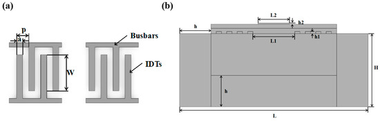 (a) Schematic diagram of the IDT. (b) Geometric model for FEM simulation.