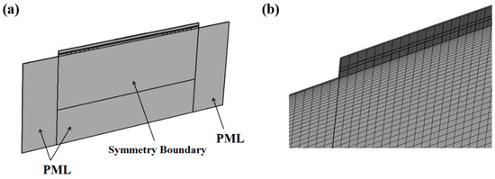 Considering the number of meshes and the computational cost, a segment in the direction of the acoustic aperture was intercepted in this model for analysis. Periodic boundary conditions were used at both ends along the direction of the aperture. To reduce the effect of reflected waves due to the simplification of the model on the propagation of SAW, the ends perpendicular to the direction of the acoustic aperture and the bottom surface of the sensor were set to perfectly matched layers (PML), as shown in Figure 3a. To optimize the calculation results of the simulation analysis, a more regular mapping mesh was utilized in this model. The mesh was generated by sweeping in the direction of the acoustic aperture, and the resulting mesh model is shown in Figure 3b. Research has indicated that when more than six grid nodes are created within each wavelength range in the simulation model, the frequency response becomes independent of the grid size [17]. In this particular model, seven grid nodes were set within each wavelength range along the direction of SAW propagation to mesh the entire sensor model, thereby regulating the mesh length in the acoustic wave propagation direction to 1.5 μm. This meticulous approach ensures both the integrity of the meshes and the precision of computations. Notably, we have taken measures to uphold the aspect ratio of rectangular mesh elements within the range of 6 to 7, further contributing to computational accuracy. It is noteworthy that the simulation model consists of approximately 6500 units.