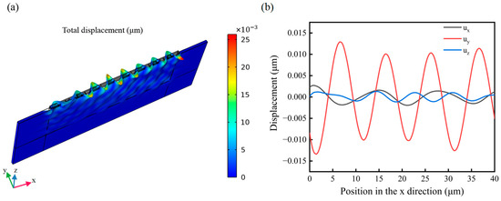 (a) Simulation diagram of the total surface displacement of the model. (b) The plot of displacements ux, uy, and uz at the surface of the sensor.