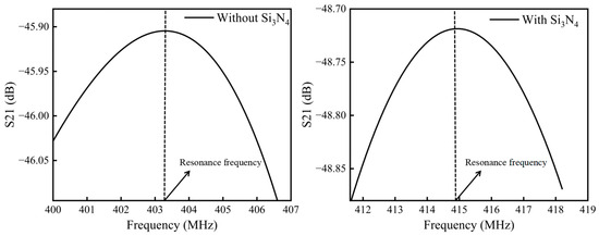 Assuming that other environmental conditions and the total thickness of the waveguiding layer in the FEM model remained constant, a layer of Si3N4 with a thickness of 0.1 λ was introduced between the LT piezoelectric substrate and the existing layer of SiO2, forming a Si3N4-SiO2 double-covered waveguiding layer. In the FEM model, when the frequency of the input signal resulted in the insertion loss S21 from the input IDT to the output IDT reaching its peak, the sensor was considered to be in a resonant state. The S21 parameter is commonly used to measure and analyze the resonance frequency of a sensor. To reduce computational complexity, analysis, and calculation were focused solely within the resonant frequency range corresponding to the resonant peak when the sensor excited an L-SAW. The resonance frequency of the sensor with the Si3N4-SiO2 double-covered waveguiding layer was compared to a sensor containing only a SiO2 waveguiding layer. The results of this comparison are presented in Figure 5.